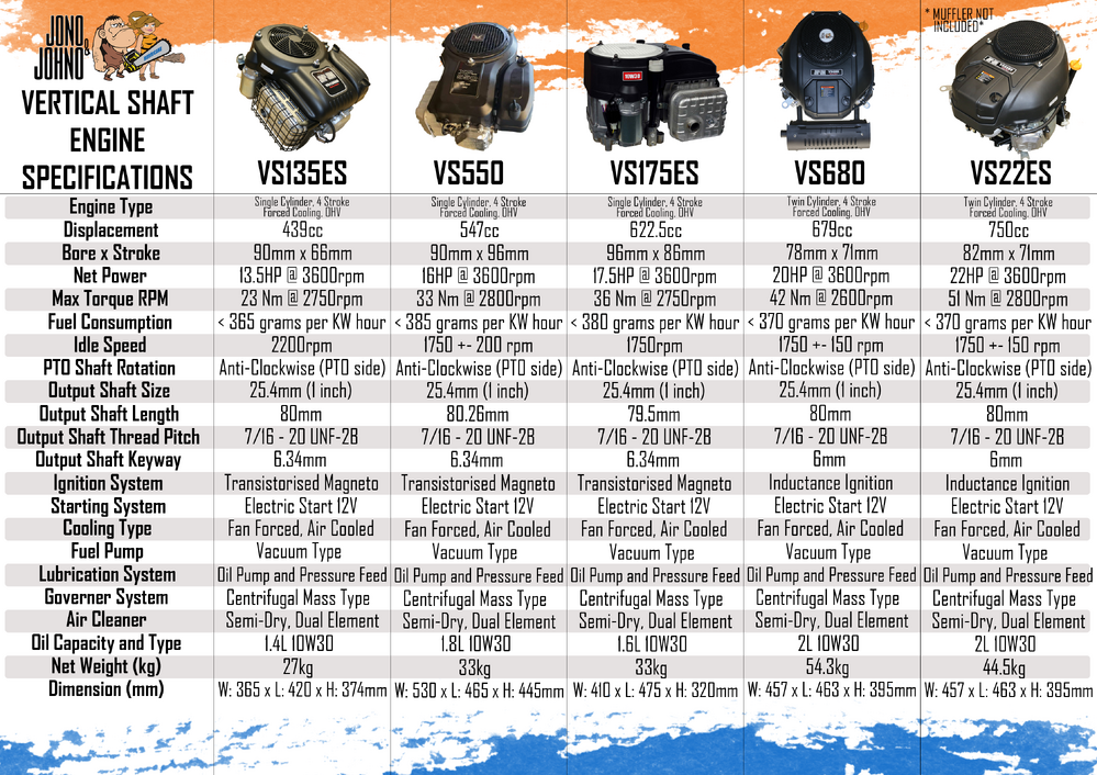 This Jono & Johno 13.5HP Vertical Shaft Engine is a rock solid beast. At 439cc and 3600rpm it will have your mower running like a dream from the second you mount it.