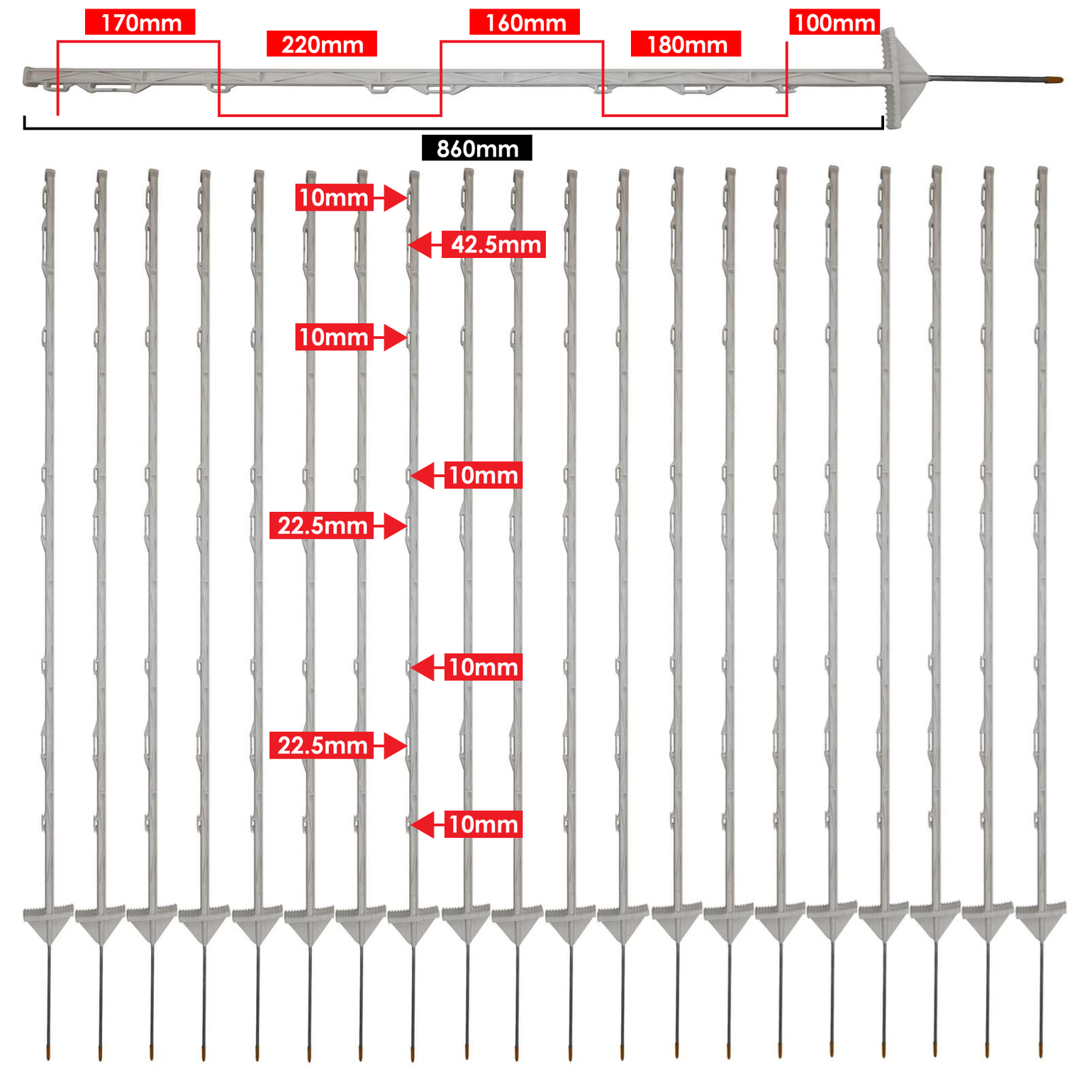 This pack of 20 tread in poly posts are designed specifically for temporary electric fencing. They are suitable to hold polytape, polywire and hotwire.